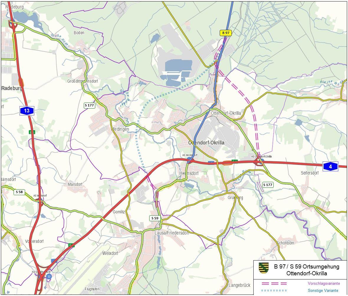 Die dann notwendige Umleitung ist von Ottendorf-Okrilla über die B 97 nach Laußnitz und weiter über die B 98 nach Glauschnitz zur S 100 nach Radeburg vorgesehen. Über die S 177 in Radeburg wird die Umleitung in Richtung Medingen geführt. Diese Umleitungsführung wird für beide Fahrtrichtungen vorgehalten.